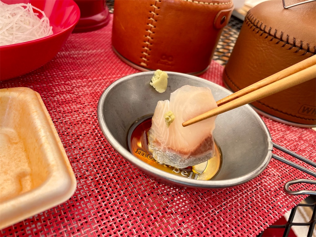 「解凍されたカンパチを、醤油とわさびでいただきます」