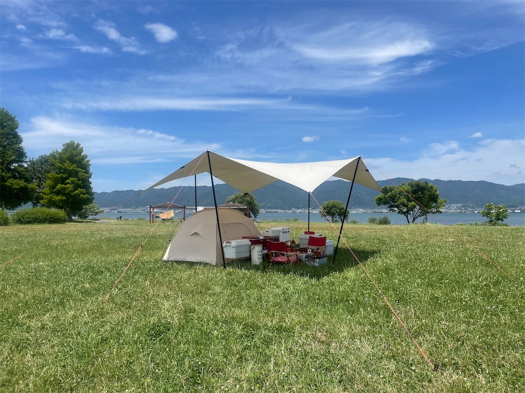 特に昼間は日差しが強いので、日除けになるタープは必要。