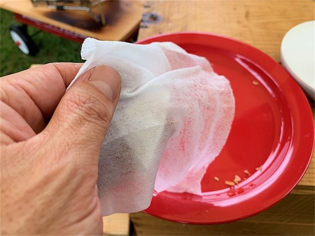 炊事棟が利用しにくい時や炊事棟がないキャンプ場の時も、ウェットティッシュで汚れを拭き取り自宅に持って帰り洗います。